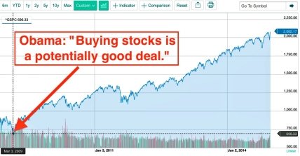 “Некоторые инвесторы, возможно, помнят предыдущий комментарий Обамы по стоимости акционерного капитала 3 марта 2009, когда S&P 500 торговались на отметке 696:” С другой стороны, то, что вы сейчас видите – это точка, когда покупка акций есть потенциально выгодным соглашением. Если у вас есть долгосрочные перспективы по ним “. С того момента, когда он выразил свое наблюдение, S&P 500 вырос на 185% и на этой неделе достиг нового исторического максимума с 1988 года.