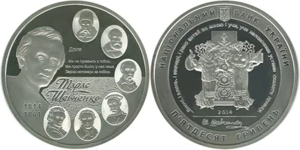 Лучшей памятной монетой 2014 года стала серебряная монета номиналом 50 грн "200-летие со дня рождения Т.Г.Шевченко" .