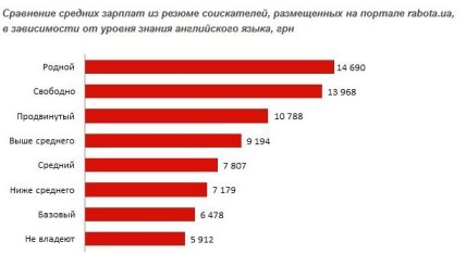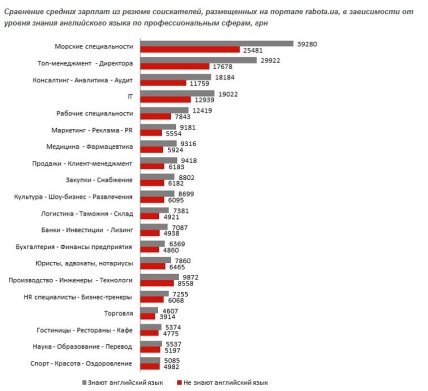 Примечательно, что IT-специалисты, которые знают английский, просят зарплату почти в два раза выше той, на которую рассчитывают их коллеги, не владеющие языком. То же самое касается топ-менеджеров — англоговорящие руководители запрашивают до 30 000 грн, а те, кто не знает языка — не более 18 000.