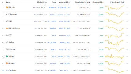 Так, за последние 24 часа Bitcoin подорожал на 2,63% до $6 586, Ethereum – на 12,59%, до $217, Ripple – на 3,71%, Bitcoin Саsh – на 6,34 %, до $463, EOS – на 7,98% – до $5,36.