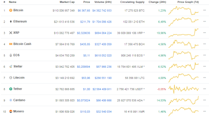 Так, за последние 24 часа Bitcoin подорожал на 1,23% до $6 367, Ethereum – на 6,49%, до $211, Ripple – на 19,96%, Bitcoin Саsh – на 4,564 %, до $435, EOS – на 4,96% – до $5,11.