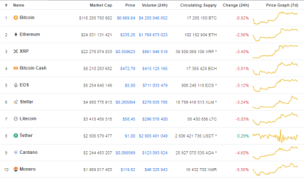 Так, за последние 24 часа Bitcoin подешевел на 0,82% – до $6 669, Ethereum – на 2,56%, до $235,2, Ripple – на 3,40%, до $0,559, Bitcoin Саsh – на 3,81%, до $472, EOS – на 3,12%, до $5,8.