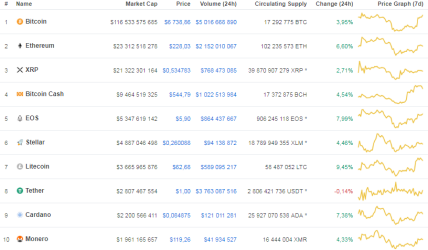 Так, за последние 24 часа Bitcoin подорожал на 3,95%% – до $6 738, Ethereum – на 6,60%, до $228, Ripple – на 2,71%, до $0,534, Bitcoin Саsh – на 4,54%, до $544,79.