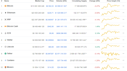 Так, за последние 24 часа Bitcoin упал в цене на 0,473% – до $6 821, Ethereum на 0,59%, до $229,7, Ripple - на 4,14%, до $0,560, EOS подорожал на 0,10%, до $5,68, Bitcoin Саsh подорожал на 1,45% – до $5429.