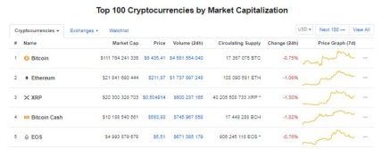 Так, за последние 24 часа Bitcoin подешевел на 0,75% – до $6 435, Ethereum – на 1,09%, до $211, Ripple – на 1,30%, до $0,504, Bitcoin Саsh – на 1,82%, до $583, EOS – на 0,76%, до $5,51.