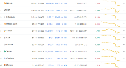 Так, за последние 24 часа Bitcoin подешевел на 1,35% – до $5 584, Bitcoin Саsh – 5,94% до $417, Stellar вырос на 4,70% до $0,242. Ethereum и XRP поменялись позициями, таким образом XRP вырос на 2,39% до $0,472, а Ethereum упал на 0,10% до $179.