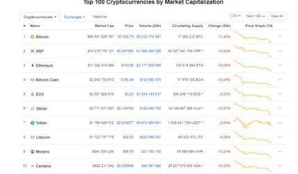 За последние 24 часа Bitcoin подешевел на 11,40% – до $3 825, Ethereum – упал на 10,06%, до $110,06, Ripple подешевел на 13,64%, до $0,347, Bitcoin Саsh рухнул на 18,84% – до $168,44, Stellar – снизился на 18,57%, до $0,144. Общая капитализация всех криптовалют составила $122 млрд.