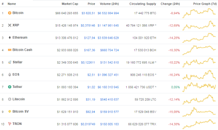 Так, за последние 24 часа Bitcoin подешевел на 8,94% – до $3 820, Ethereum – на 14,28%, до $127, Ripple – на 12,69%, до $0,378, Bitcoin Саsh – на 18,30%, до $167, EOS – на 16,24%, до $2,51.