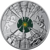 "Вверху и внизу с ракурса взгляда человека вверх изображено дерева, вершины которых тянутся к желто-зеленого круга в центре монеты, символизирует листья и солнце, слева и справа — лошади со всадниками, которые символизируют освободительную борьбу времен гайдаматчины и Холодноярской Республики, внизу среди деревьев — Троицкая церковь Мотронинского монастыря", — пояснили в Центробанке.