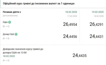 Национальный банк Украины (НБУ) на 19 февраля 2020 года установил официальный курс на уровне 24,44 гривен за доллар, что немного ниже по сравнению с предыдущим банковским днем. Об этом свидетельствуют данные на сайте регулятора.