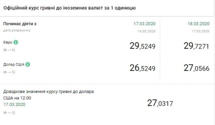Национальный банк Украины (НБУ) на 18 марта 2020 года установил официальный курс на уровне 27,05 гривен за доллар, что на 53 копейки выше по сравнению с предыдущим банковским днем. Об этом свидетельствуют данные на сайте регулятора.