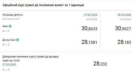 Национальный банк Украины (НБУ) на 30 марта 2020 года установил официальный курс на уровне 28,18 гривен за доллар, что на 5 копеек выше по сравнению с предыдущим банковским днем. Об этом свидетельствуют данные на сайте регулятора.