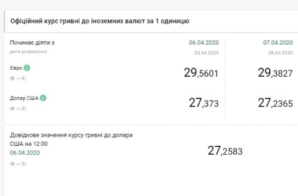 Национальный банк Украины (НБУ) на 7 апреля 2020 года установил официальный курс на уровне 27,23 гривен за доллар, что на 14 копеек ниже по сравнению с предыдущим банковским днем. Об этом свидетельствуют данные на сайте регулятора.