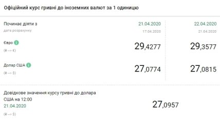 Национальный банк Украины (НБУ) на 22 апреля 2020 года установил официальный курс на уровне 27,08 гривен за доллар, что на 1 копейку выше по сравнению с предыдущим банковским днем. Об этом свидетельствуют данные на сайте регулятора.