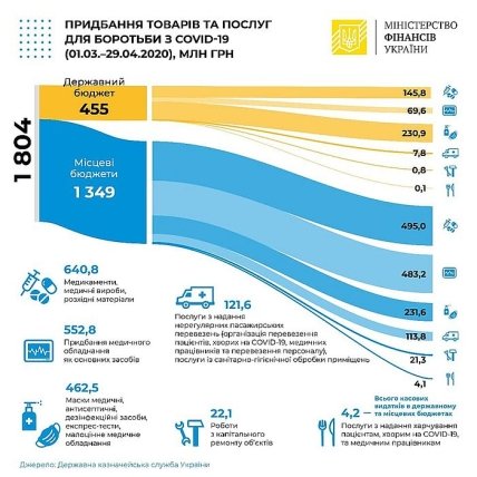 "По данным Госказначейства, с 1 марта по 29 апреля 2020 года включительно за счет бюджетов всех уровней совершены платежи (на закупку товаров для борьбы с коронавирусом - ред.) на сумму 1,8 млрд грн, в том числе 455 млн грн - средства госбюджета, 1,349 млрд грн - средства местных бюджетов", - указал Минфин в сообщении.