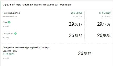 Национальный банк Украины (НБУ) на 21 мая 2020 года установил официальный курс на уровне 26,58 гривен за доллар. Курс на 7 копеек выше по сравнению с предыдущим банковским днем. Об этом свидетельствуют данные на сайте регулятора.