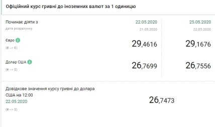 Национальный банк Украины (НБУ) на 25 мая 2020 года установил официальный курс на уровне 26,75 гривен за доллар. Курс на 1 копеек ниже по сравнению с предыдущим банковским днем.