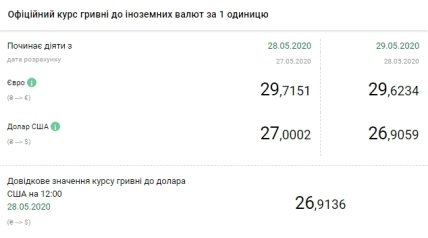 На 29 мая 2020 года официальный курс гривны установлен на уровне 26,91 грн/долл. Об этом свидетельствуют данные на сайте регулятора.