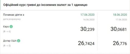Официальный курс на 18 июня 2020 года установлен на отметке 26,77 гривен за доллар. Национальный банк Украины поднял его на три копейки по сравнению с предыдущим рабочим днем.
