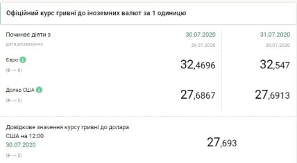 Национальный банк Украины на пятницу, 31 июля 2020 года, установил официальный курс гривни на уровне 27,6913 грн за доллар против 27,6867 грн за доллар в четверг.