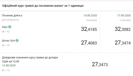Национальный банк Украины на понедельник, 17 августа, укрепил официальный курс гривни на 6 копеек — до 27,3474 грн за доллар.