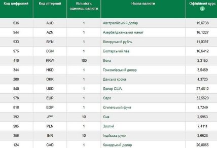 USD — 27,48 грн за 1 доллар;