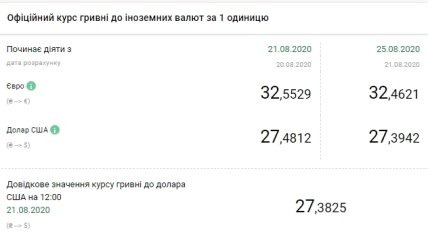 В обменных пунктах Украины 21 августа 2020 года в 12:00 курс доллара в продаже по сравнению с предыдущим рабочим днем снизился на 9 копеек до 27,54 гривен за доллар. Курс евро снизился на 13 копеек до 32,58 гривен за евро.
