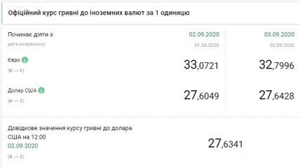 В обменных пунктах Украины 2 сентября 2020 года в 12:00 курс доллара в продаже по сравнению с предыдущим рабочим днем вырос на 4 копейки до 27,72 гривен за доллар. Курс евро снизился на 4 копейки до 32,98 гривен за евро.