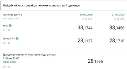 Национальный банк Украины на понедельник, 21 сентябрь 2020 года, установил официальный курс гривни на уровне 28,1718 грн за доллар.