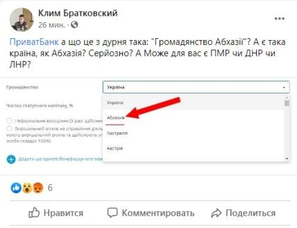 Пользователи Приватбанка заметили, что для предоставления услуг можно выбрать гражданство Абхазии. Такой факт заметил специалист в сфере информационного законодательства, авторского права и регистрации торговых марок Клим Братковский, о чем написал на своей странице в Фейсбук.