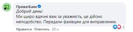 "Добрый день! Мы искренне благодарны вам за внимательность, это действительно безобразие. Передали специалистам для исправления", - сообщили в ПриватБанке.