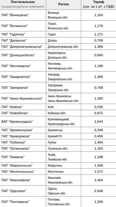 Таким образом самый низкий тариф наблюдается у ООО "Мегаватт Енерго" из Киева и составляет 5,95 грн. за 1 м³, с НДС.