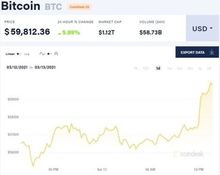 Переход почти к 60 000 долларов США увеличивает рыночную капитализацию биткойнов до 1,12 триллиона долларов.