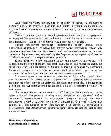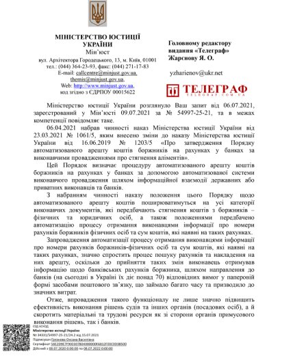 В ответе на запрос в Министерстве юстиции Украины подтвердили информацию "Телеграфа" о лишь автоматическом аресте банковских счетов должников с 6 июля. Также в министерстве отметили, что на сегодняшний день принудительное списание средств со счетов, открытых должниками в банках, осуществляется исключительно на основании платежного требования исполнителя в бумажном виде.