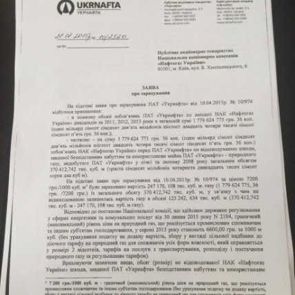 "Укрнафта "заявляет о зачислении своих обязательств по уплате "Нафтогазу" дивидендов за 2014 год в общей сумме 632,304 млн гривень в счет обязательств НАКа перед "Укрнафтой" по возмещению ущерба, причиненного безосновательным использованием имущества, — природного газа в объеме 123 242,634 тысячи куб. м на сумму 632 304,449 тысяч гривени", — отмечается в документе.