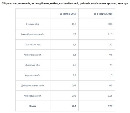 Наибольшие поступления от ренты Укрнафты получили громады Сумской (40,8 млн грн), Ивано-Франковской (21,3 млн грн) и Полтавской (17,2 млн грн) областей.