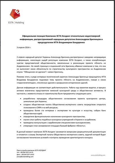 Согласно с официальным сообщением компании ЭСТА Холдинг, поступившим в нашу редакции, данная информация, распространенная Александром Бригинцом не является неправдивой.