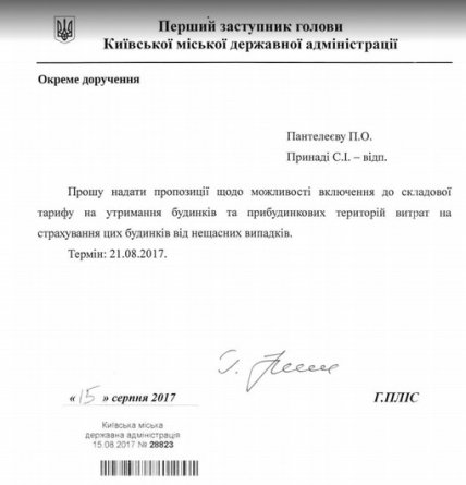 "Прошу предоставить предложения относительно возможности включения в состав тарифа на содержание домов и придомовых территорий затраты на страхование этих домов от несчастных случаев", - сказано в документе, который направлен к выполнению заместителю председателя КГГА Петру Пантелееву и директору департамента экономики и инвестиций Светлане Принаде.
