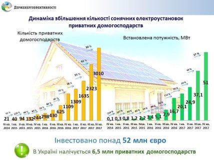 "Стремительный спрос населения на "солнечную" электроэнергию объясняется принятым в 2015 Законом Украины № 514-VIII, которым предоставлено выгодный "зеленый" тариф с привязкой к курсу евро. Это означает, что домохозяйство может продавать избыток сгенерированной "чистой" электроэнергии в сеть и быстро возвращать средства, вложенные в солнечные панели безоговорочно по инфляции", — отметил Председатель Госэнергоэффективности Сергей Савчук.