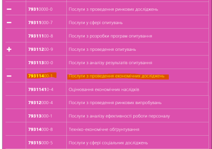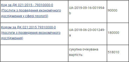 Код по ДК 021:2015 — 79310000-0 (Услуги по проведению экономического исследования в сфере геологии). Код 79310000-0: Услуги по проведению рыночных исследований. Плановая сумма закупки: 90 000,00 UAH. Плановая дата: июль 2019 года.