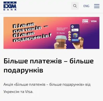 Банк зазывает открывать у них платежные карты Visa и Mastercard и совершать ними безналичные расчёты. В период с 01.05.2023 по 31.07.2023 г за такие платежи "Укрэксимбанк" обещает бонусы: 1 бонус за каждые потраченные 100 грн. Далее эти бонусы банк предлагает обменивать на подарочные карты ОККО или WOG. Также за баллы якобы можно будет выиграть ноутбук, айфон, набор марок "Укрпочты" или денежные сертификаты.