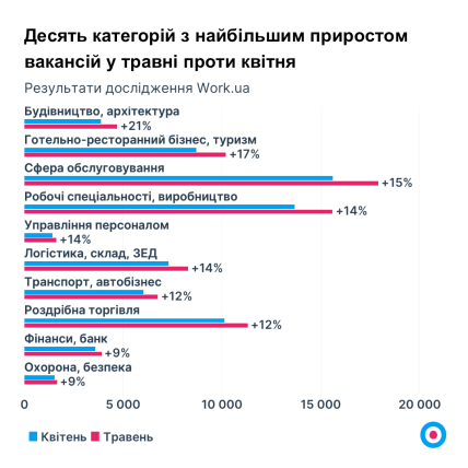 Самый больший прирост в процентах был зафиксирован в Тернопольской (+17% — 2171 вакансия), Ивано-Франковской (+14% — 2832), Сумской (+13% — 828), Ровенской (+13% — 1 868) и Харьковской (+12% — 3131) областях.