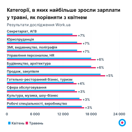 Среди категорий с высокой зарплатой сохраняется стабильность — лидируют "Недвижимость" и "Топ-менеджмент, руководство высшего звена", где предлагают 30 000 грн. В категории "Транспорт, автобизнес" средняя зарплата составляет 20 500 грн, в "Продаже, закупке" — 20 000 грн, а "Маркетинге, рекламе, PR" — 19 000 грн.