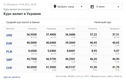 По данным портала "Минфин", средний курс доллара в украинских банках 15 июня находится на уровне 36,95 грн (покупка) и 37,40 (продажа). Наличный курс — 37,22 (покупка) и 37,31 (продажа). Официальный курс Национального банка Украины — 36,56.
