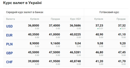 По данным портала Минфин, сегодня, 28 июня, средний курс доллара в украинских банках составляет 36,80 грн (покупка) и 37,40 (продажа). Наличный курс — 37,23 (покупка) и 37,32 (продажа). В то же время официальный курс Национального банка Украины — 36,56.