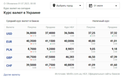 По данным портала "Минфин", в субботу, 1 июля, средний курс доллара в украинских банках составляет 36,80 грн (покупка) и 37,40 (продажа). Наличный курс — 37,25 (покупка) и 37,32 (продажа). В то же время официальный курс Национального банка Украины остается неизменным — 36,56 грн.