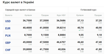 По данным портала Минфин, в понедельник, 10 июля, средний курс доллара в украинских банках составляет 36,75 грн (покупка) и 37,35 (продажа). Наличный курс — 37,13 (покупка) и 37,20 (продажа). В то же время официальный курс Национального банка Украины — 36,56.
