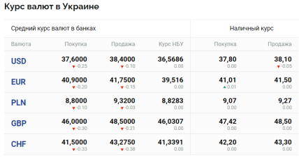 По данным портала Минфин, во вторник, 29 августа, средний курс доллара в украинских банках составляет 37,60 грн (покупка) и 38,40 (продажа). Наличный курс — 37,80 (покупка) и 38,10 (продажа). В то же время, официальный курс Национального банка Украины остается неизменным — 36,56 грн.