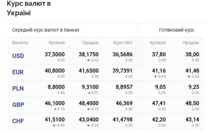 По данным портала Минфин, в пятницу, 1 сентября, средний курс доллара в украинских банках составляет 37,50 грн (покупка) и 38,17 (продажа). Наличный курс — 37,80 (покупка) и 38,00 (продажа). В то же время, официальный курс Национального банка Украины остается неизменным — 36,56 грн.