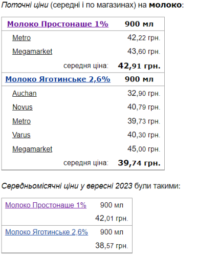 То есть, за месяц молоко "Простонаше 1%" подорожало на 90 копеек, а "Яготинское 2,6%" — на 1,17 гривны.